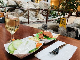 夕方もレストランがオープンしているので、大スクリーンなどがあり、スポーツ観戦している人たちが大盛り上がりになるとうるさいのですが、緑も多く、リラックスできる空間です。